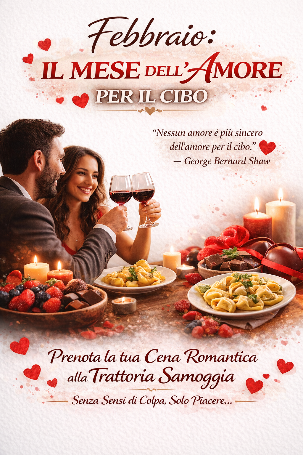 Febbraio è il mese dell’amore per il cibo e per chi ami. Alla Trattoria Samoggia vivi una cena romantica senza sensi di colpa, in un luogo intimo e curato. Prenota ora.